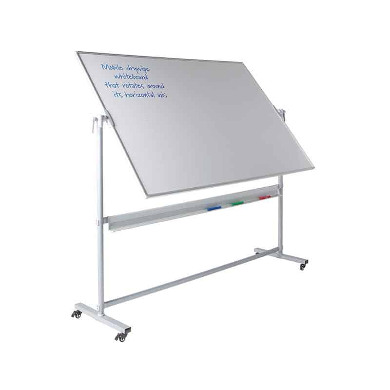 • Double sided whiteboard that can pivot on either its horizontal or vertical axis, enabling both sides to be used, or the surface angled towards the audience
