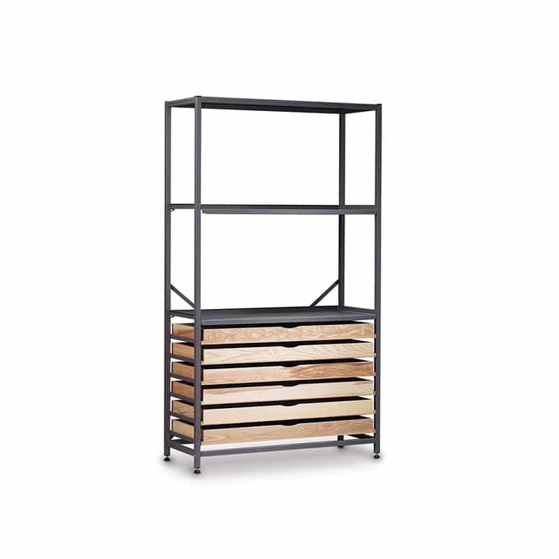 - Options of all tray storage, or a mix of plastic trays & open steel shelves