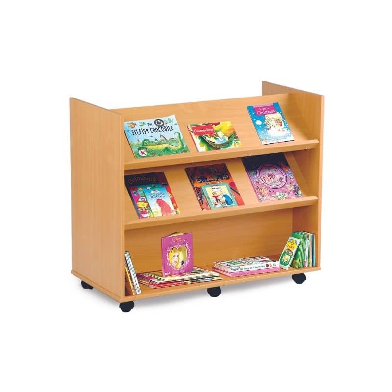 - Double sided library unit with 2 angled display shelves each side and a flat storage shelf in attractive beech finish