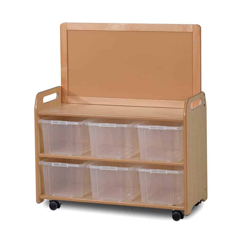• Mid height Unit with 2 levels of storage – 6 clear tubs included • Comes with top display panel – use for display of notices or children’s works, also acts as a convenient room divider • Velcro display surface on reverse • Free removable mirror attaches to Velcro on reverse • Top add-ons can be easily removed and interchanged • Anti-scratch, low noise, lockable castors • W900 x D400 x H1040mm - Top shelf: H560mm