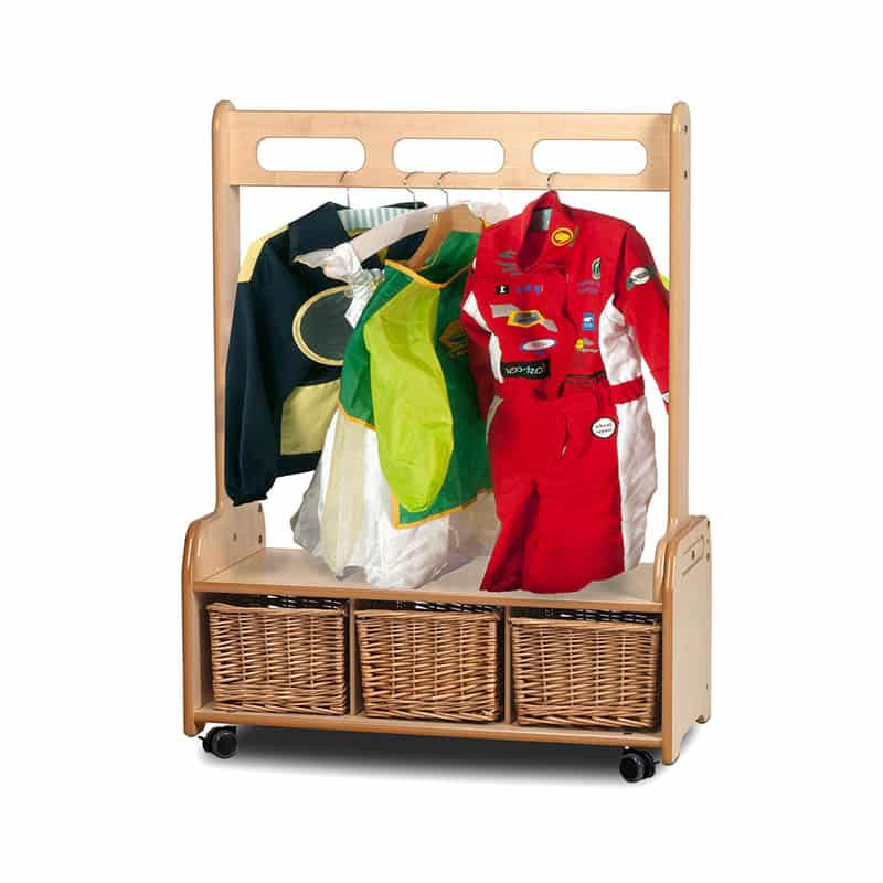 • Low storage unit with 3 Clear Tubs and a removable add on attachement • Dressing up add-on with hanging rail – also be used as a cloakroom/changing unit • Anti-scratch, low noise, lockable castors • Resources accessible from both sides • W900 x D400 x H1180mm - Top shelf: H320mm