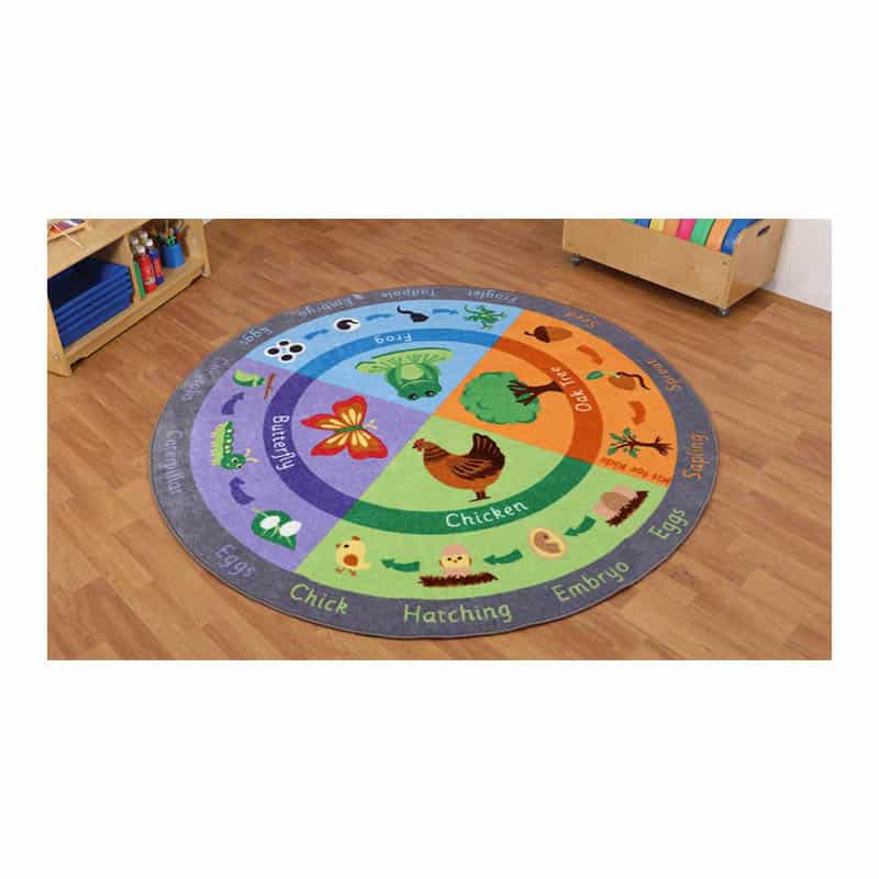 • Colourful circular floor carpet showcasing four examples of life cycles in the natural world • Covers both the animal and plant kingdoms • Functional, hard-wearing carpet ideal for group floor reading activities and discussions • Heavy duty thick soft pile • Anti-slip rubber backing • Size: 2 x 2m