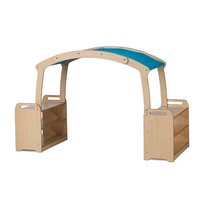 • Combining storage and play, these den sets are ideal for creating cosy reading corners, quiet play areas, or for use as a tunnel to divide areas. • The den cave roof is easily attached to the storage units using the Allen key and fixings supplied – meaning the canopy can be removed when not required • Made from premium maple melamine which is hard wearing and easy to clean. • Includes two open storage units and the den cave roof add-on • Baskets available to order separately • Roof Colour: Blue • Dimensions when set up: W2250 x D900 x H1400mm • Den Play Space: W1450 x D900 x H1400mm